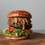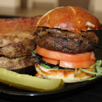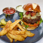 8oz burger, Crispy Pastrami, Grilled Onions, Lettuce, Tomato, Truffle Aioli