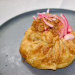 Potato Knish Stuffed with Pulled Beef, Pickled Onions & Mustard Seeds