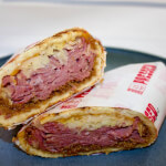 Steamed Corned Beef, Kraut, Spicy Pickle, Pickled Mustard Seeds Pressed on a House Pressed Flat. Vegan Cheese Available on Request.