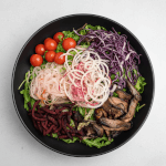 Arugula, Purple Cabbage, Cherry Tomato, Grilled Mushrooms, Spiralized Beets, Red Onion