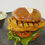 Chicken Schnitzel, Tomato, Pesto, Red Onion Served on a House Pressed Flat.
